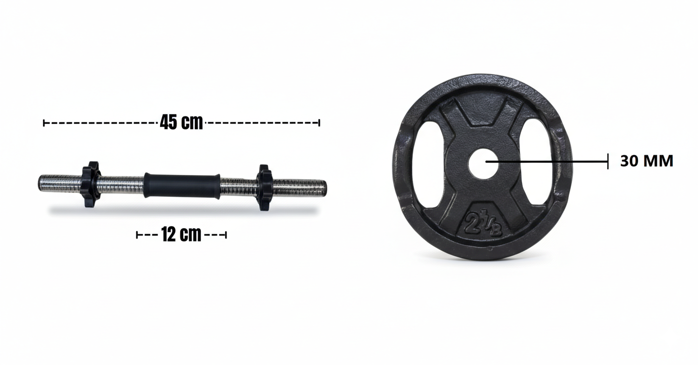 ✔ Sistema Modular: Usá los discos en la barra larga o en las mancuernas según el ejercicio.